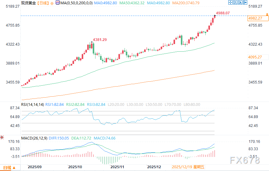 技术分析显示,周五金价走势较为震荡,表明在5000美元下方市场普遍持谨慎态度。一些交易员似乎因担心这一重要整数关口可能成为阶段性顶部而犹豫不前。