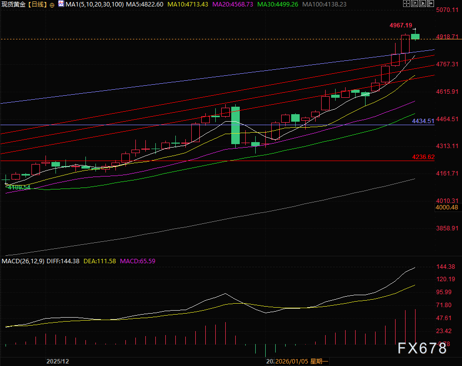 周一(1月26日)国际金价超预期延续强势表现,跳空高开0.49%之后大幅上扬逾2%,成功突破每盎司5000美元关口,盘中一度涨至5110,再创历史新高,目前交投于5090附近。